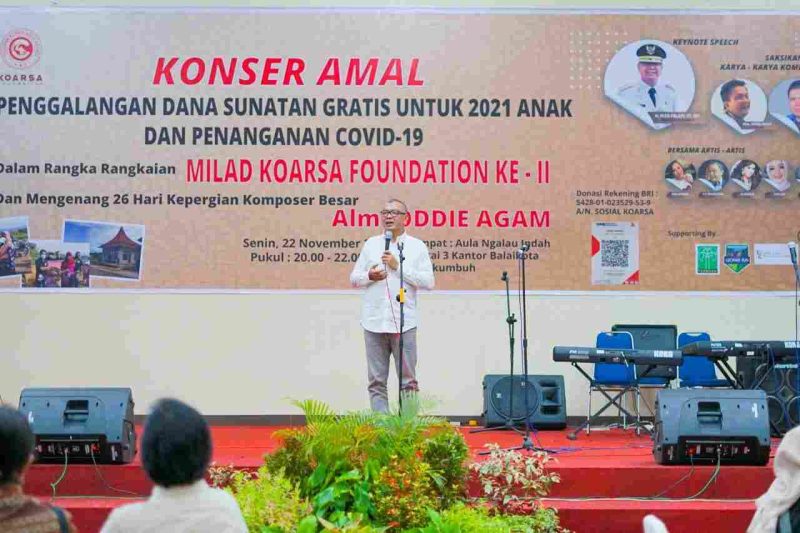 Payakumbuh | tipikal.com — Pada peringatan milad Yayasan Konco Arek Sahati (Koarsa Foundation) yang Ke II serta mengenang 26 hari kepergian komposer besar Oddie Agam, yayasan mengadakan penggalangan dana untuk penanganan Covid-19 dan Sunatan Gratis Untuk 2021 Anak di Aula Ngalau Indah Balai Kota Payakumbuh, Senin (22/11) malam.