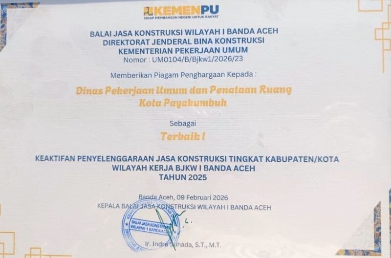Payakumbuh | tipikal.com — Dinas Pekerjaan Umum dan Penataan Ruang (PUPR) Kota Payakumbuh meraih Penghargaan Terbaik I pada Penilaian Kinerja dan Pembinaan OPD Sub-Urusan Jasa Konstruksi di wilayah kerja Balai Jasa Konstruksi Wilayah I Banda Aceh, Senin, (09/2/2026).