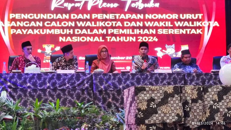 Payakumbuh | tipikal.com – Komisi Pemilihan Umum (KPU) Kota Payakumbuh menggelar rapat pleno terbuka untuk pengundian dan penetapan nomor urut pasangan calon (paslon) Wali Kota dan Wakil Wali Kota dalam rangka Pemilihan Kepala Daerah (Pilkada) serentak nasional 2024. Acara yang berlangsung di GOR M. Yamin pada Senin, (23/09/2024) ini dipimpin oleh Ketua KPU Kota Payakumbuh, Wizri Yasir, yang didampingi oleh empat komisioner lainnya.