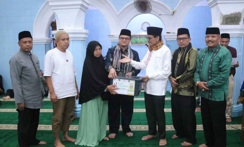 Penghujung Kegiatan Safari Ramadan, Bupati Safaruddin bersama rombongan menyerahkan bantuan untuk pembangunan Masjid Baitul Kiramah senilai 20 juta Rupiah serta bantuan sembako Baznas kepada masyarakat Jorong Balai Cubadak, Nagari Taram. (tim)